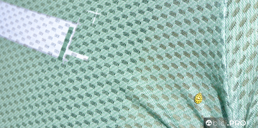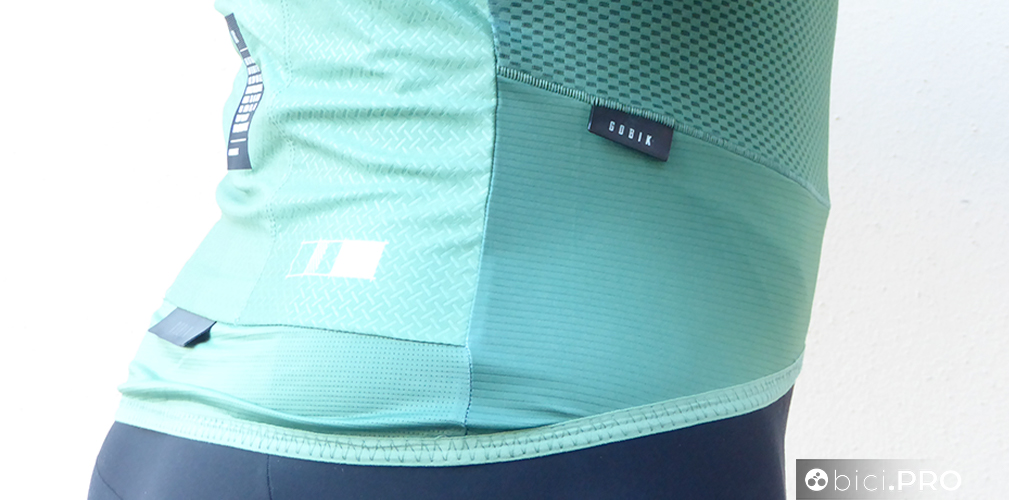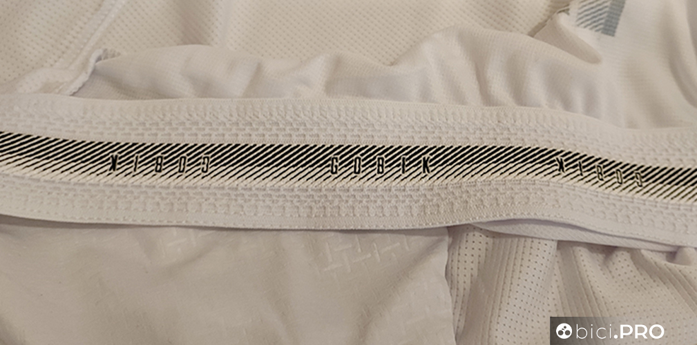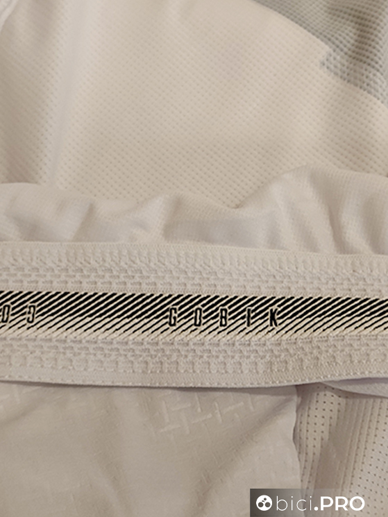 La pannellatura frontale è disegnata come un nido d’ape. Non è ruvida, ha una zip lunga ed il collo ribassato, quest’ultimo con un tessuto orlato e liscio, a favore di un comfort maggiore. Il giro vita ha un tessuto con una trama più fitta e un orlo che gira lungo tutto il perimetro della shirt. L’obiettivo è anche quello di fornire un sostegno ottimale e di non “sfarfallare”, rimanendo sempre perfettamente aderente al busto.