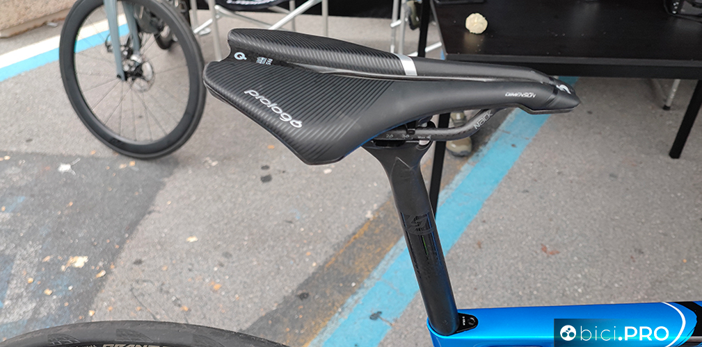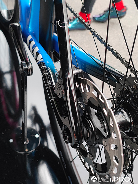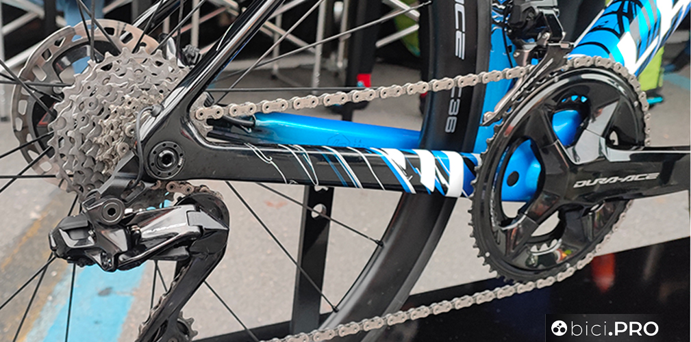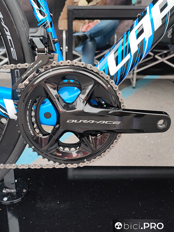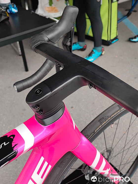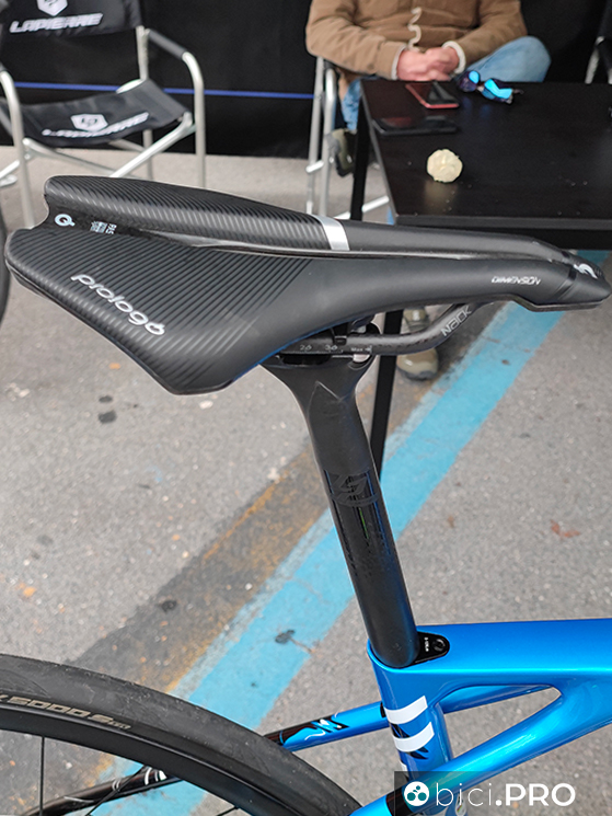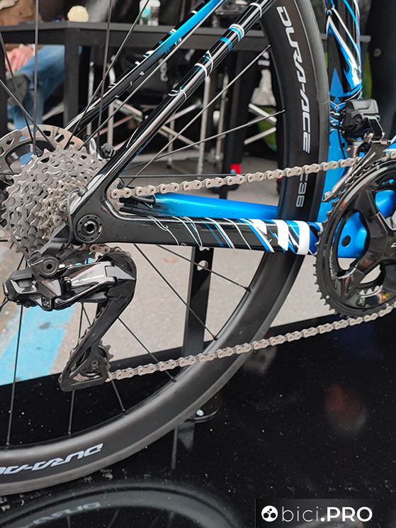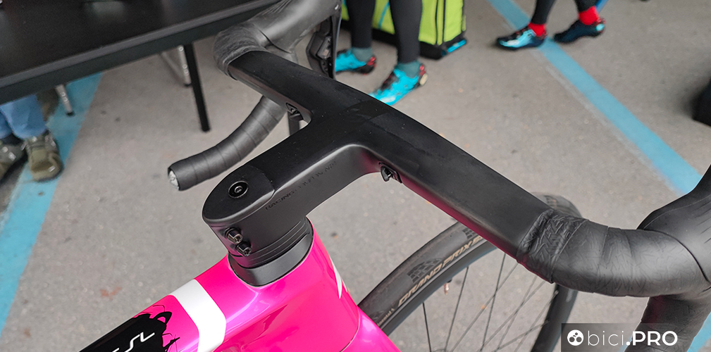La trasmissione è la Shimano Dura Ace Di2 a 12 velocità (36-52 e 11-30) e include anche il pacchetto ruote C36. Il montaggio degli pneumatici prevede i Continental GP5000 TR da 25 millimetri, quindi già in versione tubeless. La sella è la Prologo Dimension Nack da 143 millimetri di larghezza.