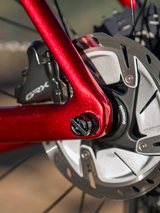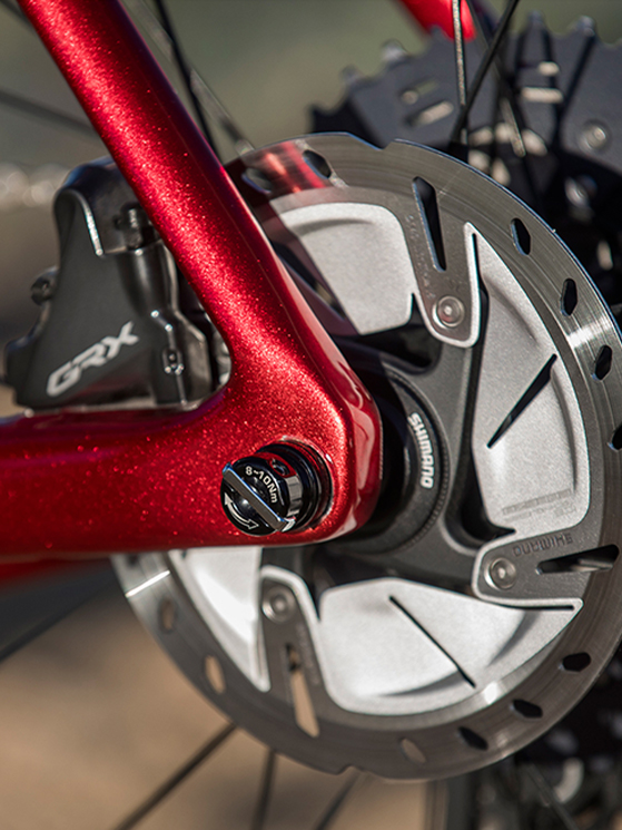 Un altro aspetto che ne avvalora la stabilità è racchiuso nella frenata progressiva, dolce e potente su qualsiasi tipo di terreno. Le GravelX utilizzano freni con tecnologia Flat Mount di Shimano. Sia il triangolo posteriore sia quello anteriore sono progettati pensando agli sforzi e alle tensioni prodotti nelle frenate a disco, completamente diversi da ciò che avviene con un freno convenzionale. Infine gli assi passanti thru axle da 12 mm forniscono sicurezza e rigidità all’insieme, permettendo un assemblaggio e disassemblaggio facile includendo un dado a farfalla per la filettatura.