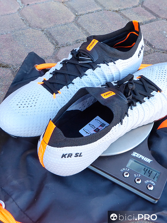 La tomaia in Knit 3D è una sorta di marchio di fabbrica che accomuna le scarpe all’apice del listino di DMT. Questo tessuto è funzionale al comfort, alla ventilazione e alla performance tecnica di una categoria di calzature che fanno della comodità un fattore non secondario. Le stringhe sono compatte e sono senza aria, aspetto che offre dei vantaggi nella tenuta del nodo. E poi la suola full carbon ha una forma completamente diversa rispetto ai modelli che hanno preceduto la KR SL, meno spanciata sull’avampiede e con una arco plantare più basso. Ci sono le feritoie che aiutano un abbondante ingresso dell’aria anche da sotto.
