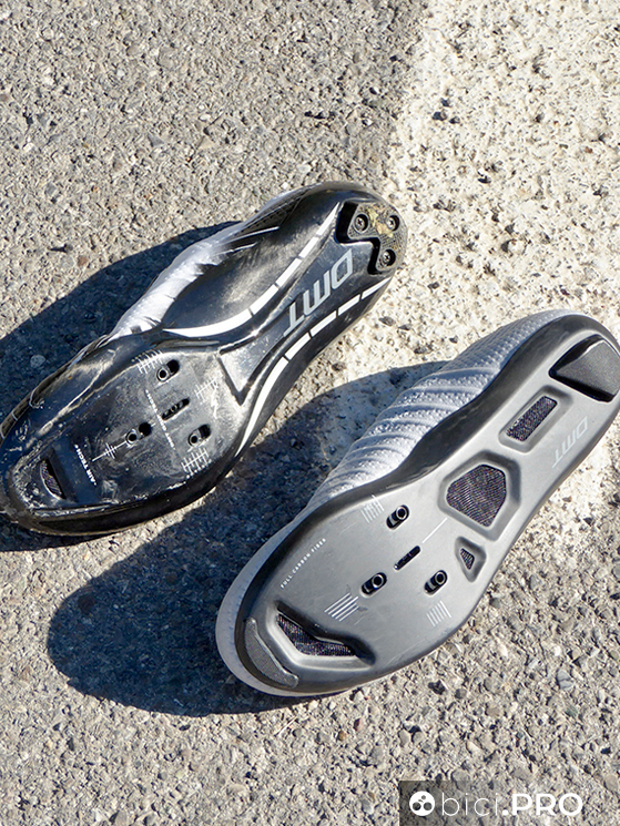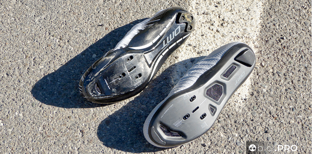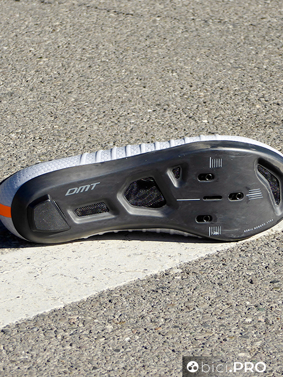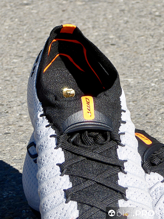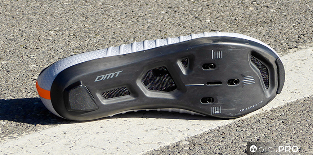 La linguetta non è separata, ma è integrata alla tomaia, con la sua piccola tasca superiore che nasconde il nodo delle stringhe. La talloniera è nascosta e non è estremamente rigida, neppure ingombrante, il tutto a favore di un comfort eccellente e di zero punti di pressione. Qui ci sono due piccoli cuscinetti che hanno l’obiettivo di bloccare il piede. Il profilo della DMT KR SL è basso, per una calzatura che lascia tanta libertà all’articolazione e alla porzione superiore del piede. La suola è tutta in carbonio, ha 4 aperture in totale (con una retina di protezione nel mezzo) e la predisposizione con i tre fori (sono ben 8 i millimetri di scarrellamento). Davanti e dietro ci sono degli inserti protettivi per la suola.