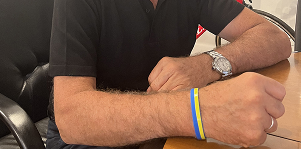 Il braccialetto con i colori dell’Ucraina che verrà indossato da ogni persona al Tour de PologneCzeslaw Lang mostra il braccialetto con i colori dell’Ucraina che verrà indossato da ogni persona al Tour de Pologne