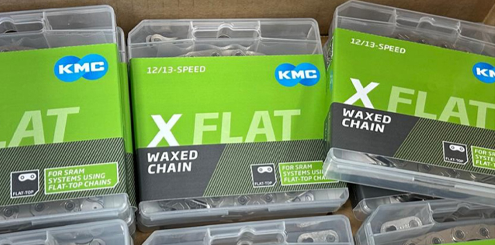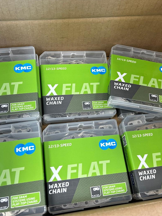 KMC ufficializza la nuova catena con il profilo piatto specifica per le trasmissioni Sram di ultima generazione, a 12 e 13 rapporti. X Flat Waxed porta in dote la qualità costruttiva KMC, una serie di trattamenti votati alla longevità ed efficienza del prodotto, non in ultimo il trattamento con una cera sviluppata appositamente da KMC.