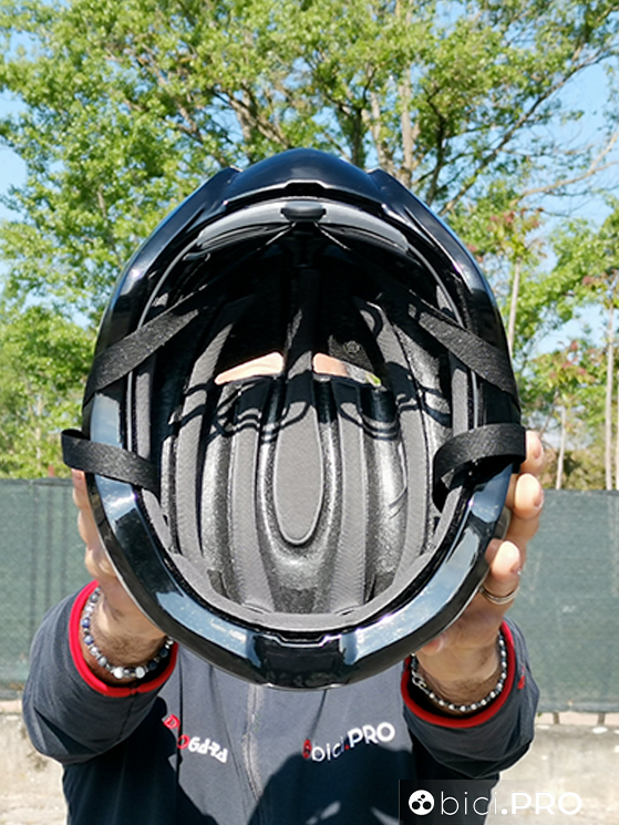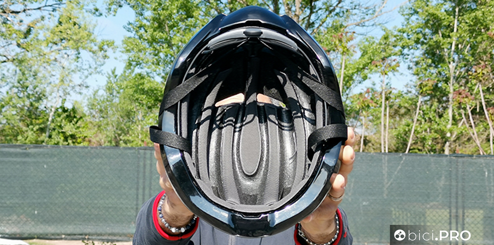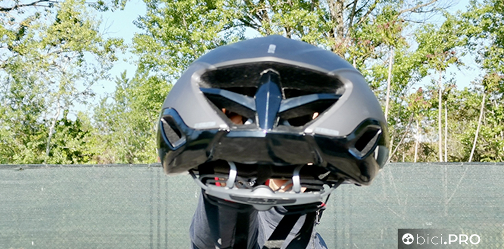 Adotta la costruzione In-Mould con una sorta di conchiglia differenziata in tre parti. Da una parte abbiamo il mold interno ricoperto e protetto dallo strato esterno. Dall’altra c’è questa sorta di anello che chiude completamente il casco nella zona perimetrale esterna. Infatti, il mold non è visibile neppure nella parte bassa e a contatto con la fronte. E poi c’è l’inserto posteriore UFO Speed, un vero e proprio codino che ha il compito di aumentare l’efficienza aerodinamica. Questo può essere rimosso.