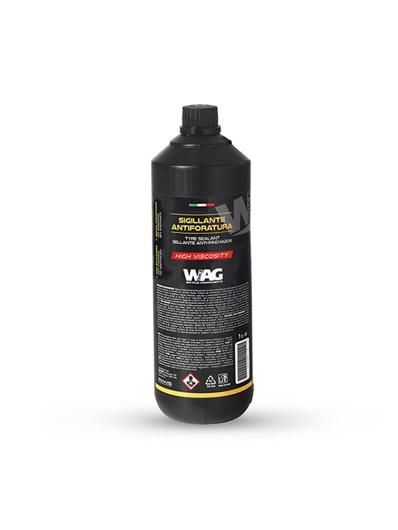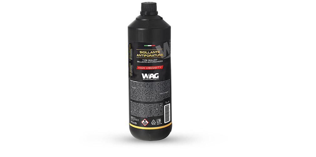 Andiamo a scoprire alcuni prodotti appartenenti ad alcune delle gamme sopra citate. Partiamo con il Sigillante Antiforatura high viscosity, che con l’avvento dei tubeless anche sulla strada è un prodotto molto ricercato. Il sigillante di Wag ha una formula non schiumosa ad alta viscosità che ripara in maniera istantanea il foro. Un punto importante è che non contiene ammoniaca o agenti aggressivi. Nel momento in cui entra in azione con le pressioni della gomma, non produce schiuma e sigilla rapidamente il foro. Le sue caratteristiche lo rendono ideale anche in fase di latticizzazione di ruote tubeless ready. E’ disponibile nei formati da: 250 ml, 1 lt e 5 lt. Segnaliamo che può essere usato anche con coperture con camera d’aria.