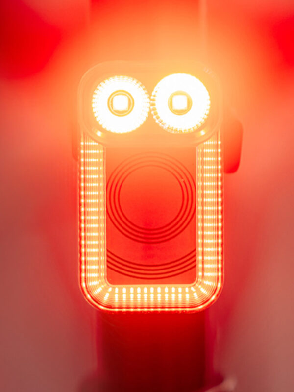 Sulla parte superiore sono presenti due interruttori di facile utilizzo: uno per la luce posteriore e uno per la registrazione della videocamera. Alimentato da una batteria da 3400 mAh con una porta di ricarica USB-C, è possibile regolare le impostazioni della videocamera e del fanale posteriore per massimizzare la durata della batteria. Il corpo in alluminio con parti in plastica contribuisce a creare un fanalino leggero e robusto, con un grado di impermeabilità IPX6 per sfidare anche il tempo avverso.
