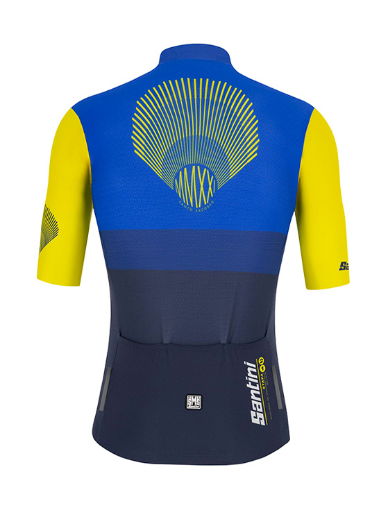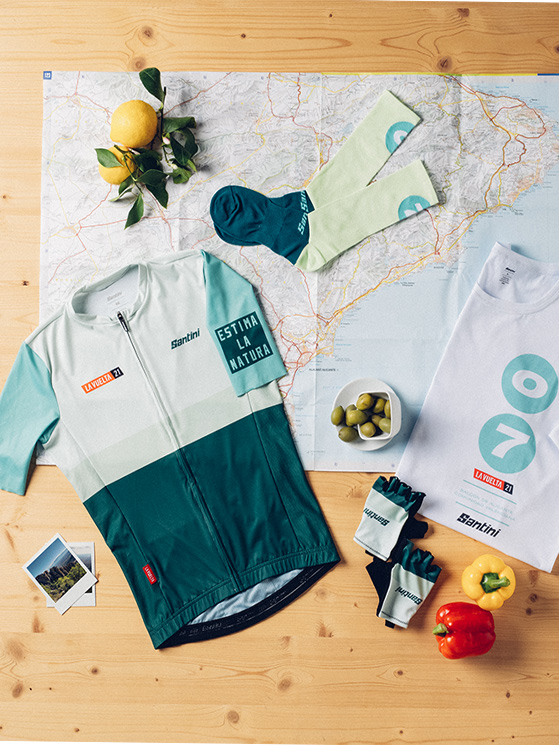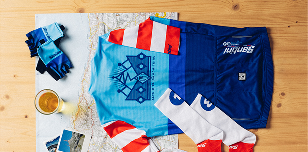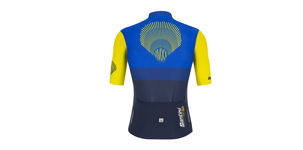 L’idea di Santini è stata di creare altri 5 kit, composti da: jersey, pantaloncino, calzino, cappellino, guantini e maglietta in cotone, pensati per onorare i passaggi simbolo della corsa. Su ogni maglia ci sarà un numero, che sarà quello della tappa che con essa viene celebrata. Scopriamoli insieme