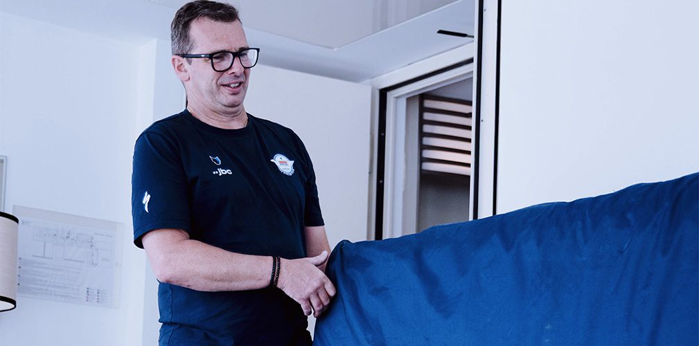 E’ un’operazione che parte uno-due giorni prima. Due addetti contattano l’hotel in cui dormiremo, chiedono di rimuovere i materassi delle camere così che li possano trovare liberi con la sola rete. All’arrivo del nostro furgone dedicato, installano i materassi Body Trainer di Manifattura Falomo. Ogni materasso e anche ogni cuscino ha il nome dell’atleta cucito sulla fodera. Ogni mattina smontiamo tutto, infiliamo i materassi in speciali cover antimacchia e antibatterici. Li carichiamo e ripartiamo verso la tappa successiva.