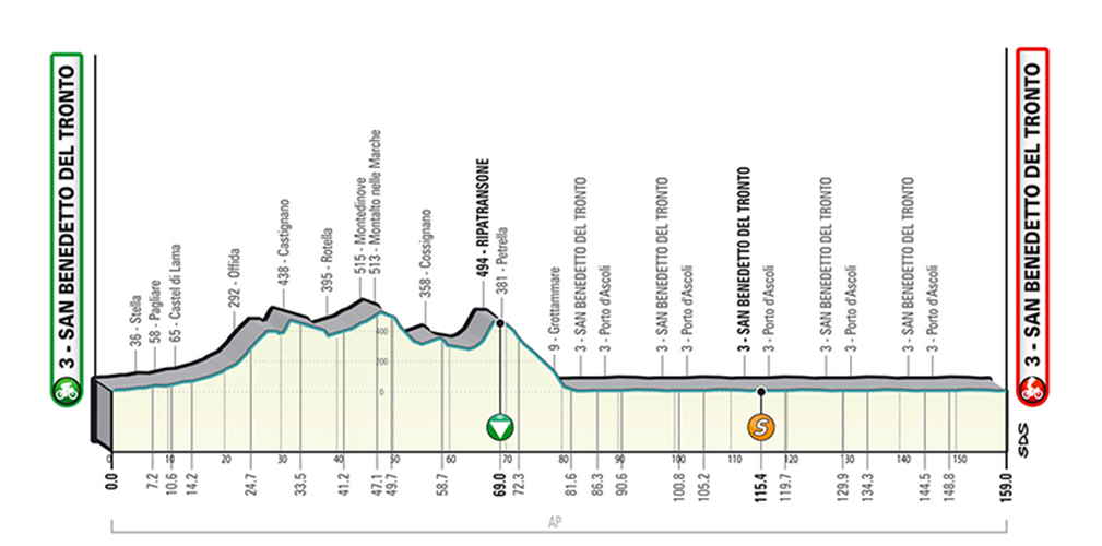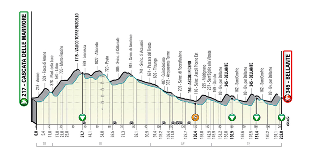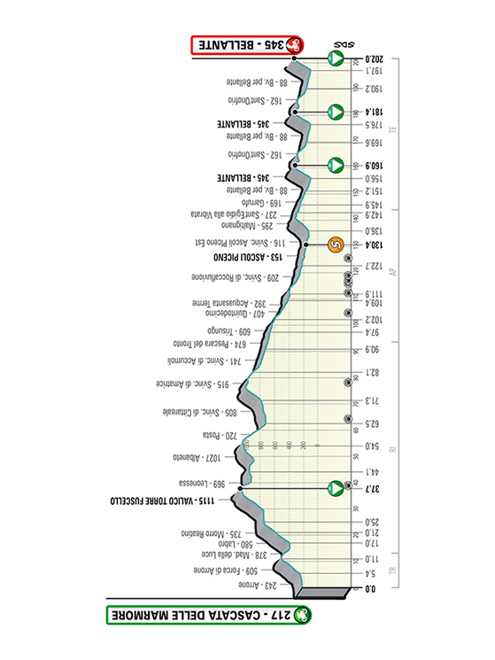 Il circuito finale di Bellante del giovedì, dopo la triste sfilata sulla Salaria del terremoto e della mancata ricostruzione, proporrà tre scalate della salita finale che, dopo 200 chilometri si farà rispettare: 4,7 chilometri con pendenze intorno al 7% e uno strappo all’11% nell’ultimo chilometro.