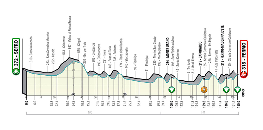 Il giorno di Fermo, un assaggio di Liegi. Monte Urano. Capodarco. Primo passaggio a Fermo. Madonna d’Ete e ancora Fermo, con quel passaggio al 21% (in tutto 800 metri al 12,6% di pendenza media) che dal fondovalle riporta il gruppo sulla strada principale verso l’arrivo.