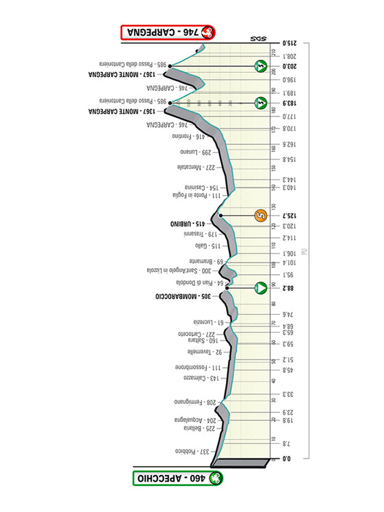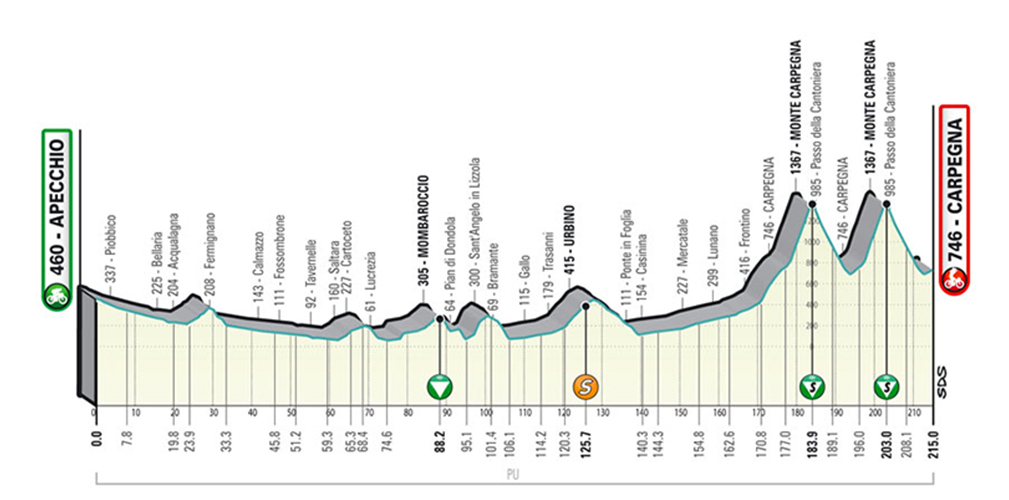 La musica cambia l’indomani con la doppia scalata del Carpegna, salita che deve la sua fama agli allenamenti di Marco Pantani. Sarà affrontata per due volte negli ultimi 45 chilometri, in cui il termine pianura perde di ogni significato. La salita misura 6 chilometri, ha dislivello di 594 metri e pendenza media del 9,9%, con punte del 15% in avvio. A questo punto tutto sarà deciso, con l’ultimo chilometro in leggera ascesa a chiudere le danze.