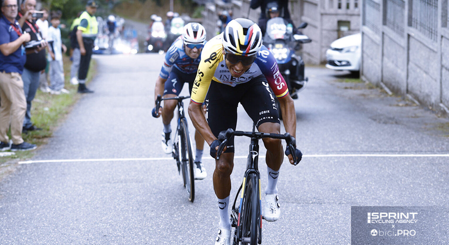 Landa e Bernal restavano in due grazie alla foratura che aveva fermato il terzo fuggitivo, Clement Braz Afonso. I tre avevano fatto la differenza sull’Alto de Prado, una scalata durissima con punte al 18 per cento. Bernal mostrava grande gamba: quando tirava lui, il gruppetto si allungava e anche i colli degli altri fuggitivi. Landa era uno dei pochissimi a resistere, ma con fatica.