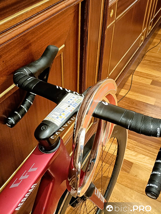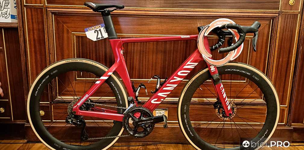 E’ una Canyon Aeroad CFR, quindi un progetto che ha già qualche anno di vita (non ci stupiremmo di vedere ufficialmente una nuova versione al prossimo Tour de France, o subito dopo), con il cockpit integrato Canyon e con un arretramento sella maggiorato, rispetto a qualche stagione a dietro.