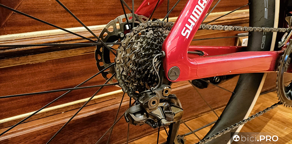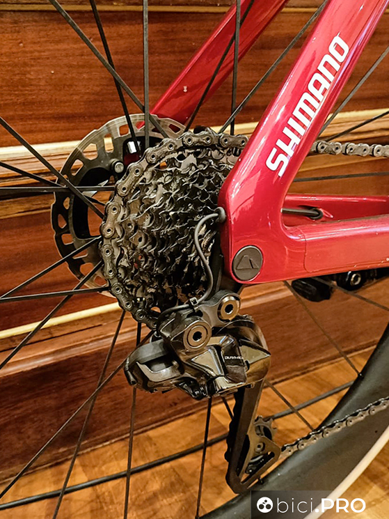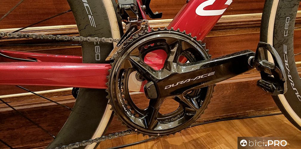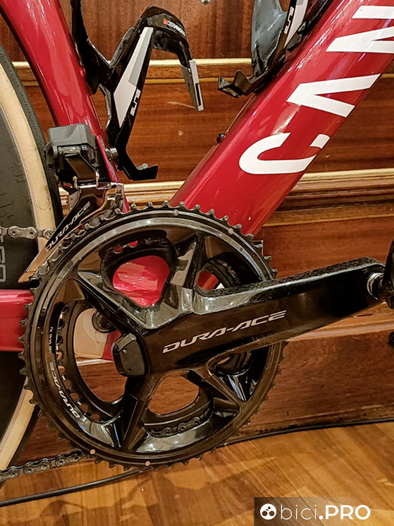 Una trasmissione Shimano Dura Ace a 12 rapporti, con la guarnitura 54/40 anteriore, power meter di ultima generazione incluso, pignoni con scala 11/30 dietro. Le pedivelle che usa Van Der Poel sono da 172,5.