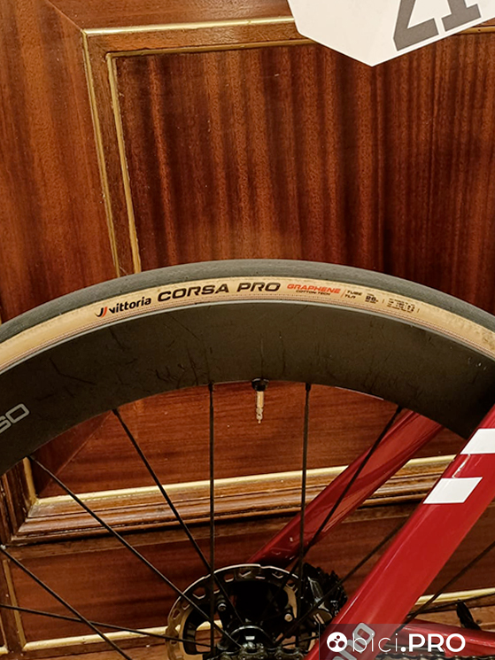 Anche le ruote sono dell’ultima generazione Dura Ace, sono le C60 tubeless ready, gommate Vittoria TLR (tubeless) con una sezione da 26. L’atleta olandese ha scelto due dischi freno da 140 millimetri di diametro.