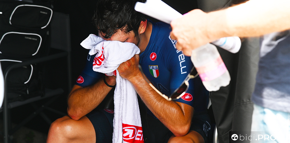 Va a sedersi sotto una tenda nera e calda come un forno. Telefona a qualcuno. Suda a vista d’occhio. Il dottor Corsetti lo assiste, consapevole della difficoltà di Scaroni e dei suoi compagni di squadra. E consapevole anche del fatto che questo ragazzo ha talento e per motivi discutibilissimi rischia di non farlo brillare. Solo dopo le premiazioni, ripresa una parvenza di equilibrio, il bresciano in maglia di leader torna al racconto, rispondendo alle domande.