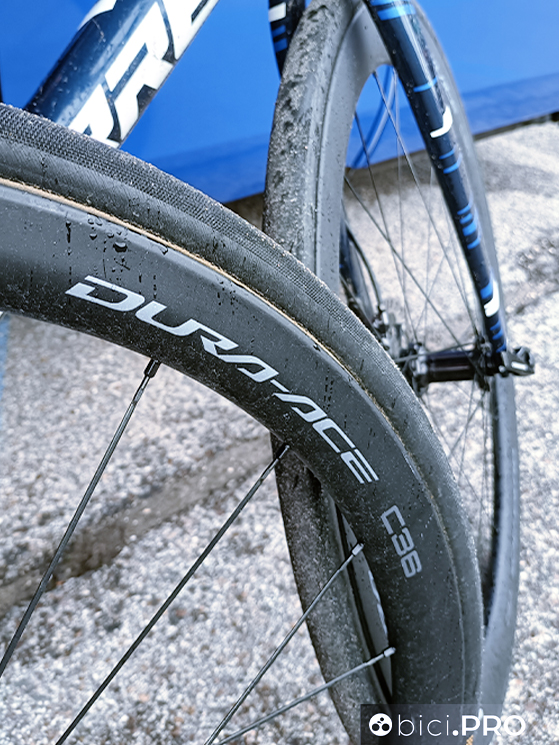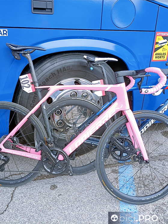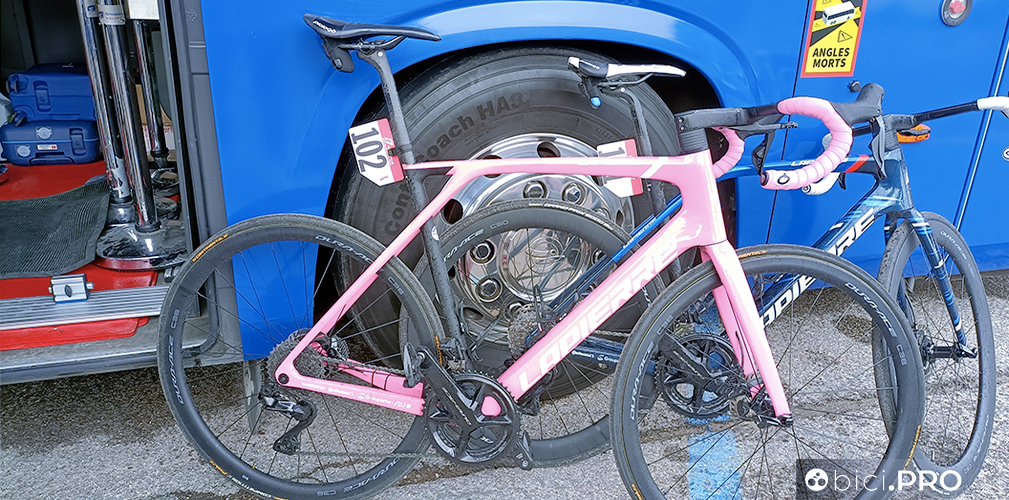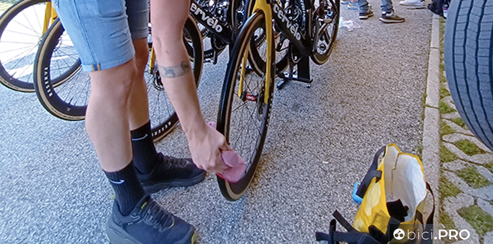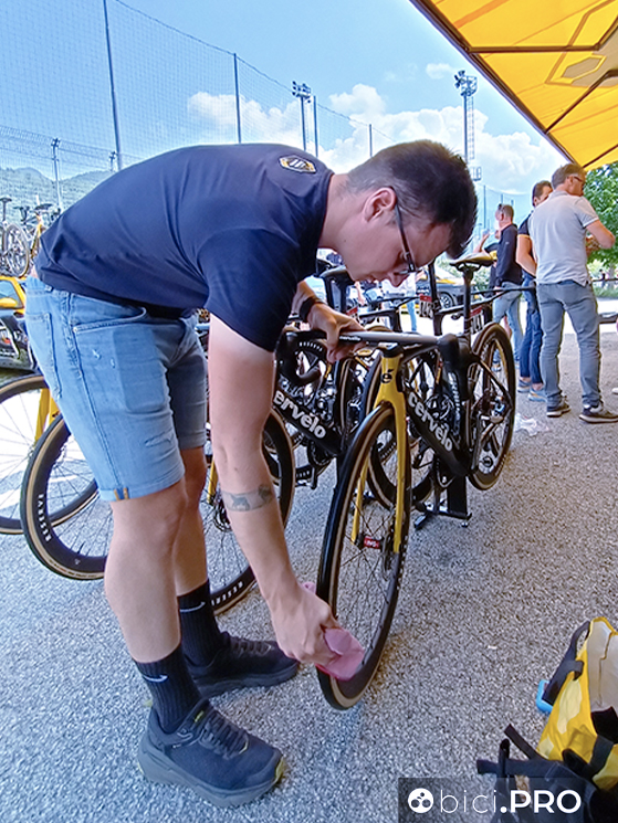Intanto il meccanico pulisce le gomme della sua Cervélo con un panno inumidito di un particolare prodotto. Per oggi, tappa veloce, Roglic e i suoi compagni hanno scelto la S5, la bici aero.
