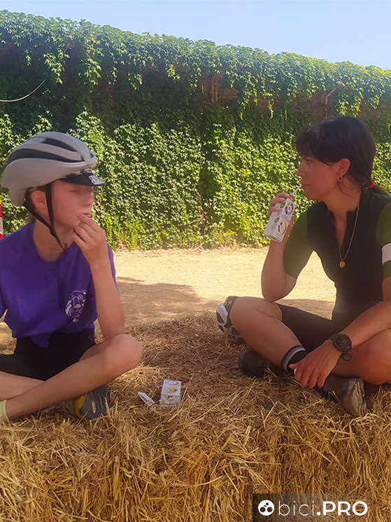 Prisca ieri ha fatto la 60 chilometri e oggi accompagna Mia, la figlia di una sua amica. Stanno addentando un panino sedute a gambe incrociate sopra una balla di fieno.