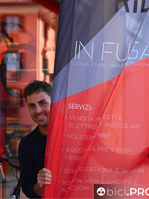 Porto Ceresio sonnecchia placido sulla sponda del lago di Lugano. La giornata è calda in modo strano, si va in bici in maglietta e pantaloncini, ma lo capisci che non è normale. L’autunno somiglia a una timida estate, mentre Luca Chirico ci aspetta sulla porta del negozio nuovo. L’ha chiamato “In fuga – Luca Chirico Bike Experience” e l’ha inaugurato giovedì scorso, anche se i lavori erano iniziati in primavera. L’idea era di aprirlo per l’estate e intercettare un po’ di stranieri, ma il progetto è cambiato perciò è slittato tutto in avanti.