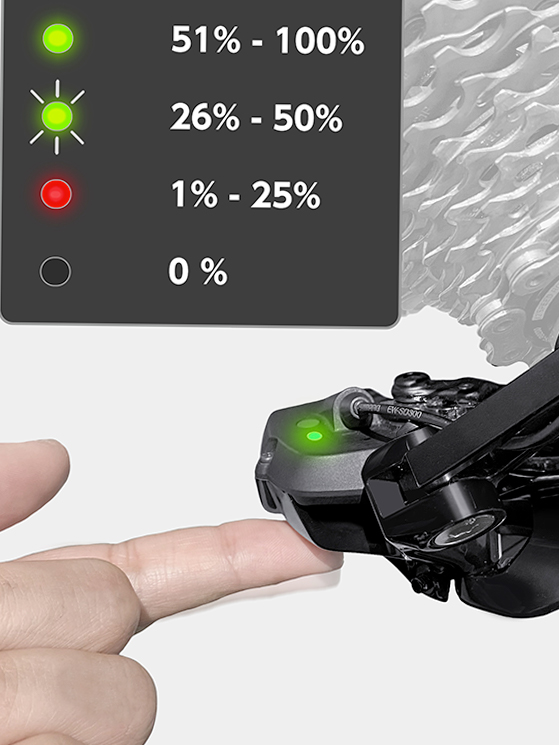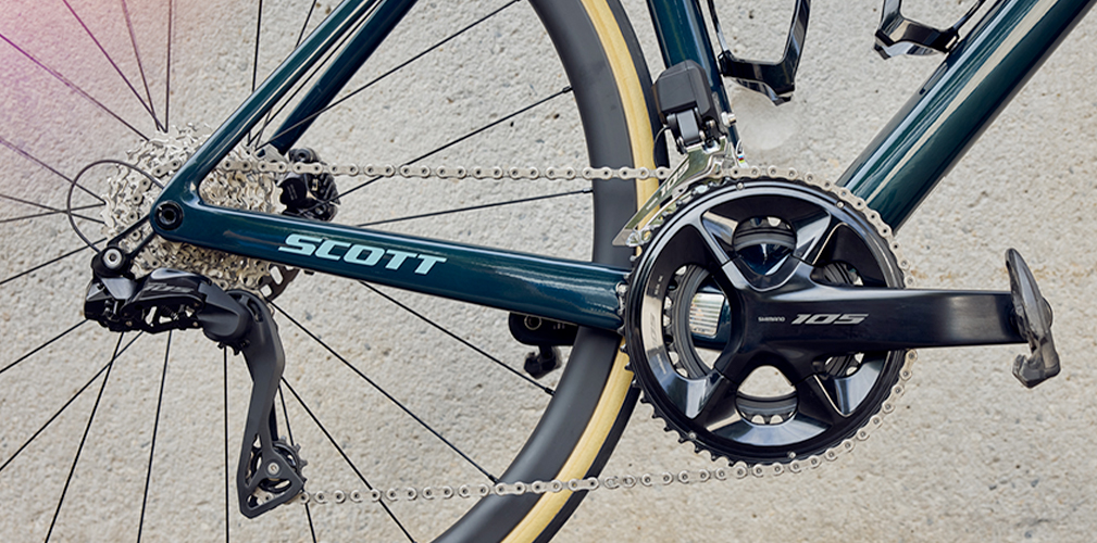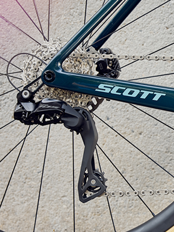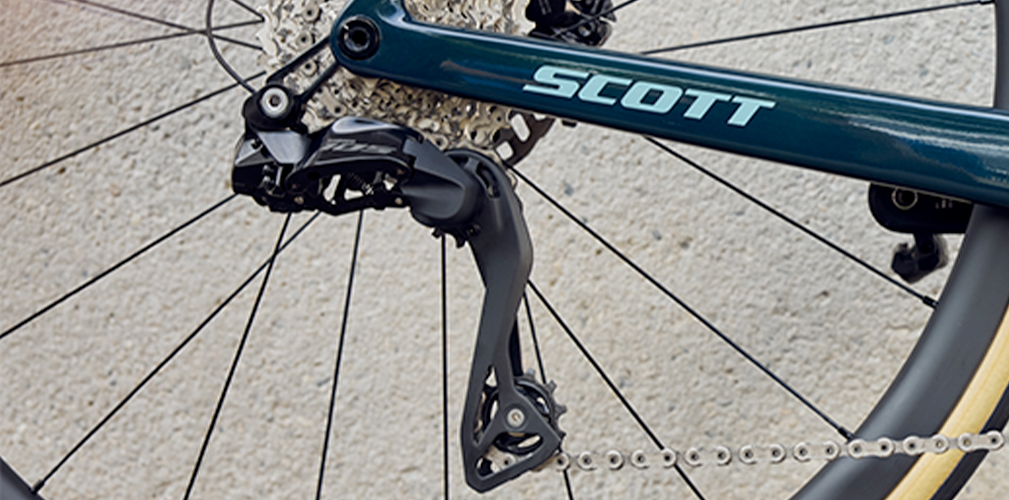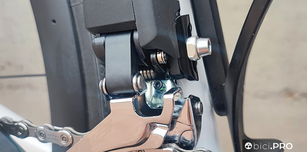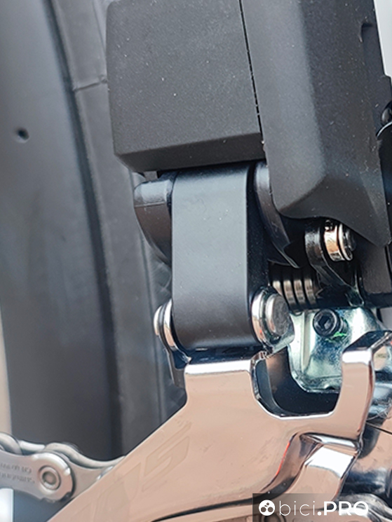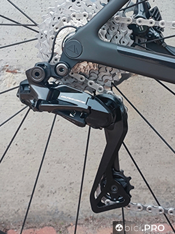L’impatto frontale ridotto e design essenziale fanno parte del del reparto trasmissione vero e proprio, ovvero del deragliatore e del bilanciere posteriore. Il primo è magro e con ingombri ridotti, due fattori da considerare anche per chi vuole usare questo pacchetto su biciclette gravel e/o dove è possibile montare gomme larghe.