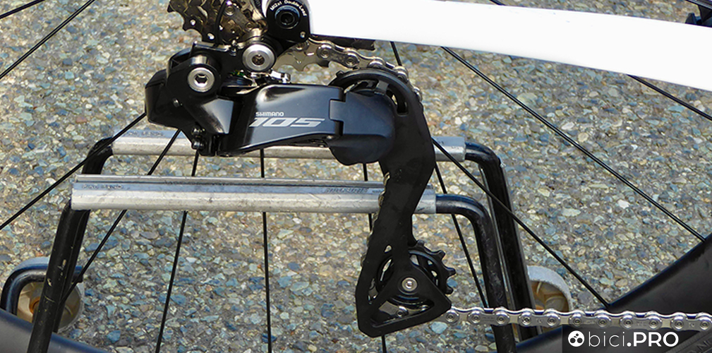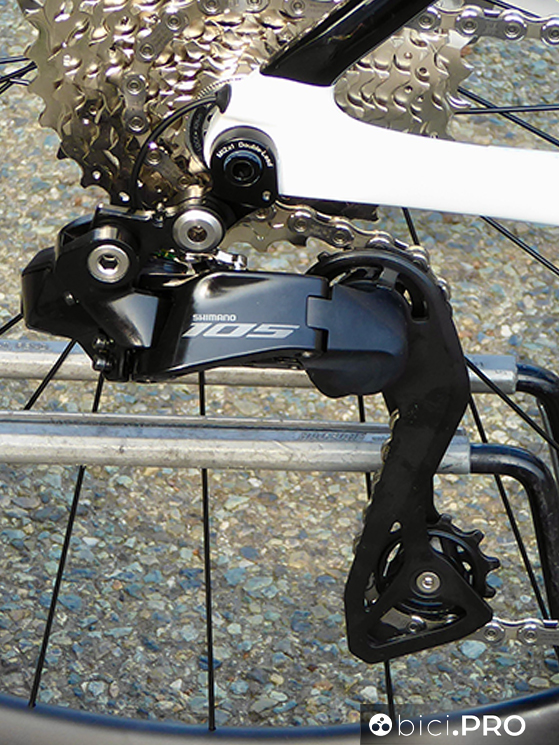 Il deragliatore del nuovo 105 include la piccola vite a brugola (il registro) per le regolazioni. Sono possibili solo meccanicamente e non attraverso le microregolazioni elettroniche. Il bilanciere posteriore la gabbia lunga che si adatta anche al 36. C’è la porta di entrata del cavo e per la ricarica della batteria. C’è il pulsante nascosto che attiva il bluetooth, le micro-regolazioni e varia le modalità di cambiata.