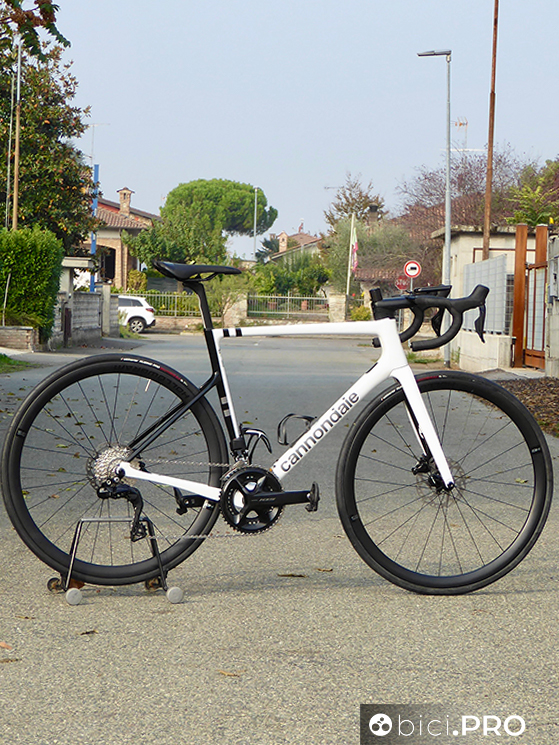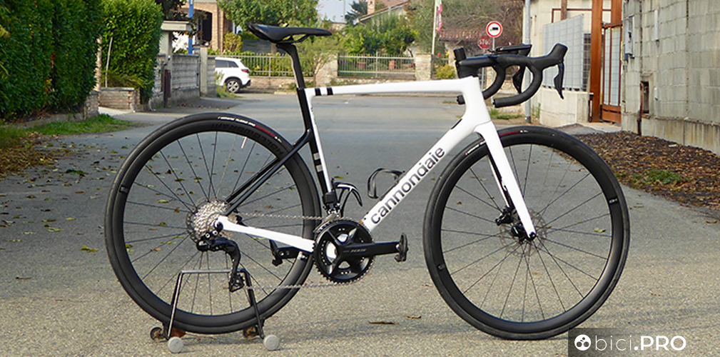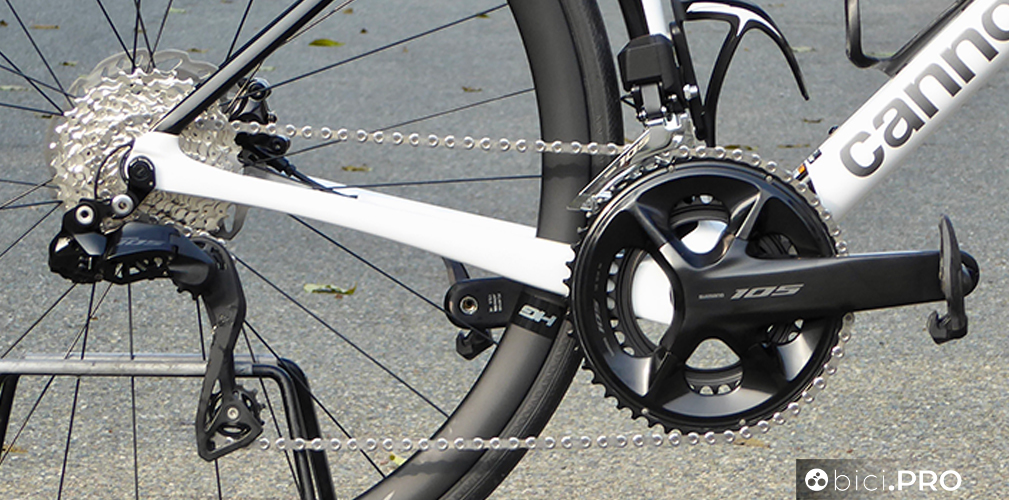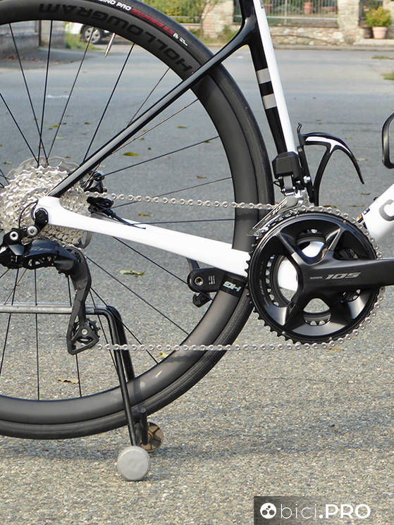 Non c’è il carbonio. Ci sono l’alluminio e l’acciaio. La customizzazione della trasmissione è possibile con la app E-Tube, proprio come Ultegra e Dura-Ace. Abbiamo provato il 105 montato sulla Cannondale SuperSix Evo.