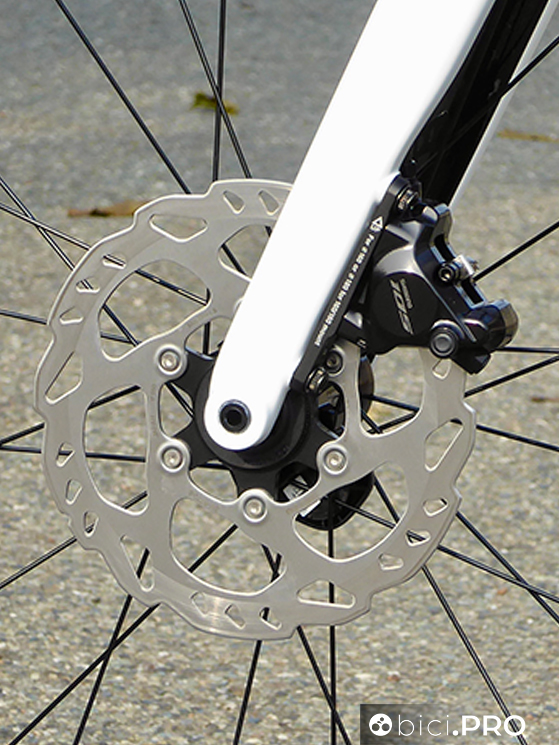 Le differenze più grandi sono relative ai dischi dei freni, diversi per materiali e disegno. Le pinze sono composte da due parti unite tra loro, proprio come gli Ultegra. Se volessimo utilizzare le stesse pastiglie uste per il Dura Ace? Non c’è problema.