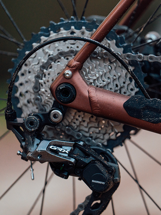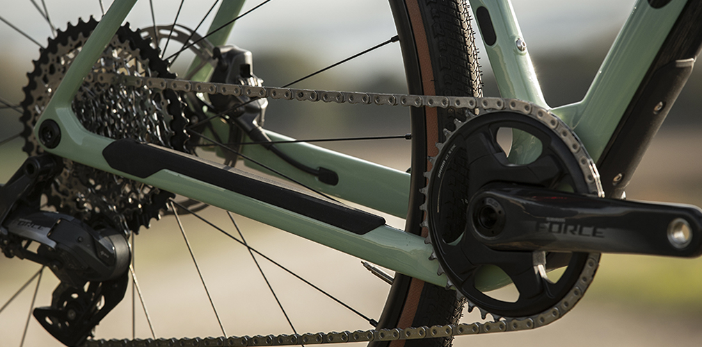 Orbea Terra Carbon è compatibile con le trasmissioni 1X e 2X (quest’ultima solo nella configurazione gravel) ed in entrambi i casi è garantito il passaggio degli pneumatici con sezione da 50 (lasciando i 6 millimetri di luce rispetto al telaio). Non è un fattore banale, dettaglio che conferma una volta di più l’attenzione dei tecnici Orbea.