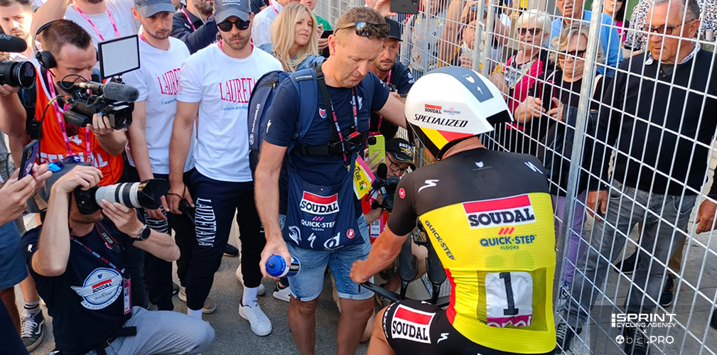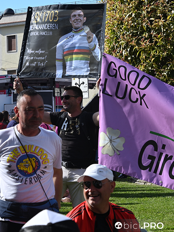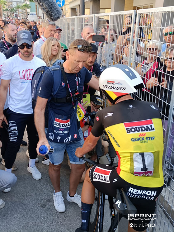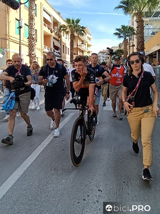Remco arriva da noi dopo aver esaurito le interviste fiamminghe nella zona mista. I giornalisti belgi sono arrivati in massa, come pure i tifosi del piccolo belga. Per l’arrivo di Roma, se tutto va come sperano, ne arriveranno 600. Desta interesse la scelta da noi annunciata stamattina della guarnitura da 60 denti, che accoppiata alla ruotona anteriore lasciano capire che il campione del mondo volesse fare una gara d’attacco.
