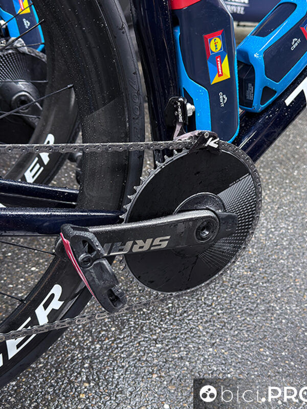Ruote Shimano Dura Ace tra C50 e C60, tubeless Pirelli da 28 millimetri e soprattutto il doppio (ormai classico) plateau anteriore 54/40 (tutto Shimano). Ci ha colpito la scelta di tutti i corridori, con i pignoni posteriori 11-30 (non 11-34). Insomma, una bici perfettamente standard (colorazione a parte) come quella vittoriosa del 2023.