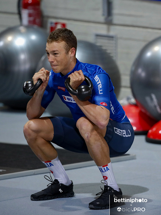 Come detto, chi non è un velocista durante l’anno può fare dello squat a carico naturale eseguendo esercizi quali i balzi, pistols o squat jump, ma uno sprinter no. Lui lavora ancora con l’80% del massimale, anche se riduce un po’ il tonnellaggio (lo ricordiamo, il totale dei chili sollevati, ndr). Questa soluzione per me può andare bene anche per il passista e lo scalatore. E questi richiami andrebbero fatti due volte a settimana.