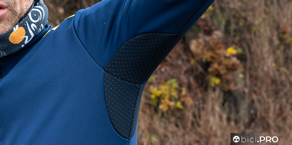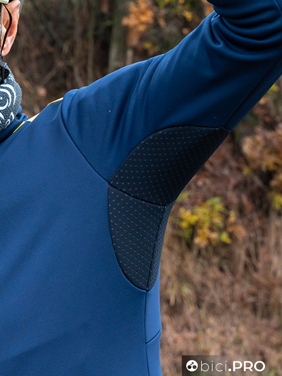 Una parte delle maniche e tutta la parte alta del busto (collo e scapole incluse) è caratterizzata dalla fodera interna in Polartec Alpha. E’ una sorta di strato irregolare “peloso” che garantisce calore, traspirazione e protezione. Esternamente è presente una pannellatura che fa scudo contro il vento. Tutta la sezione inferiore del giubbino è in rete elasticizzata. Lascia “respirare” il corpo in punti dove il contatto diretto con l’aria non è eccessivo e nei momenti di salita e con andature ridotte, permette alla maglia sottostante di non accumulare il sudore prodotto durante lo sforzo.