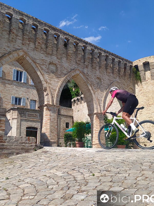 Il riscaldamento finisce presto perché dopo aver attraversato la Statale Adriatica inizia la prima delle (tante) ascese di questo giro che alla fine misurerà 92 chilometri e 1.700 metri di dislivello. In un paio di chilometri al 7-8 per cento siamo a Torre di Palme, grazioso borghetto che si affaccia sull’Adriatico. Dal suo belvedere si scorge la costa fino al Conero, mentre alle spalle il paese e i suoi vicoli di ciottolato sono “protetti” dalla fascia verde del bosco del Cugnolo.