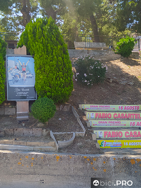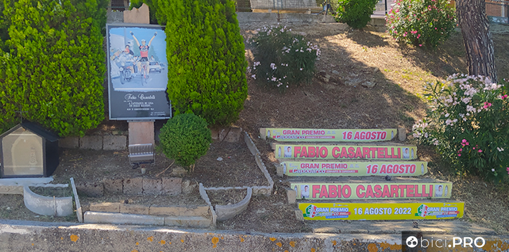 Siamo già in discesa quando superiamo il monumento a Fabio Casartelli (qui primo nel 1991 e secondo l’anno successivo) e scendiamo ancora sull’asfalto veloce costellato dalle scritte sbiadite dei tifosi che verranno rinnovate tra poche settimane.