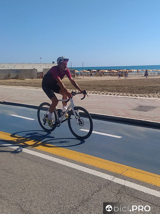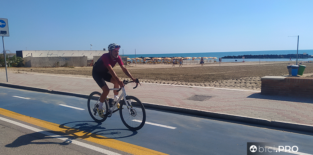 Il percorso fermano di Marche Outdoor, primo anello di Fermo Rebirth, parte dal lungomare di Porto San Giorgio, dove, seduto su un muretto all’ombra, ci attende Mauro Fumagalli di MarcheBikeLife. Davanti a lui si srotola la ciclabile bidirezionale che è stata inaugurata di recente, il cui asfalto è stato pitturato di un azzurro intenso.