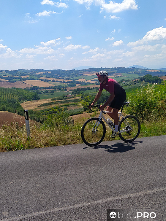 Il falsopiano prosegue fino al paese successivo e anzi l’ultimo chilometro per arrivare a Monte Vidon Combatte è abbastanza impegnativo. A perdita d’occhio ogni collina ha il suo poggio e ogni poggio un paese in cima il cui nome inizia con “Monte…”, per cui è facile accumulare centinaia di metri di dislivello in poche pedalate.