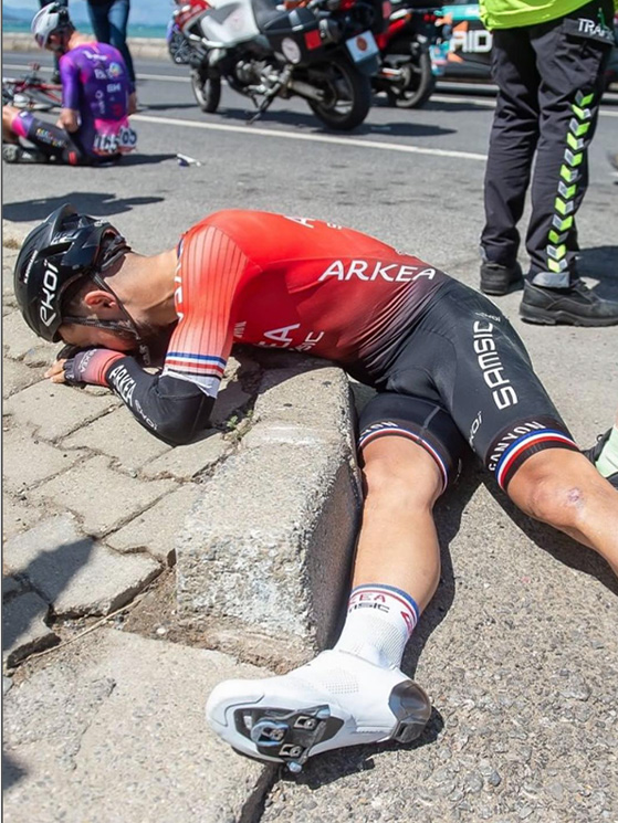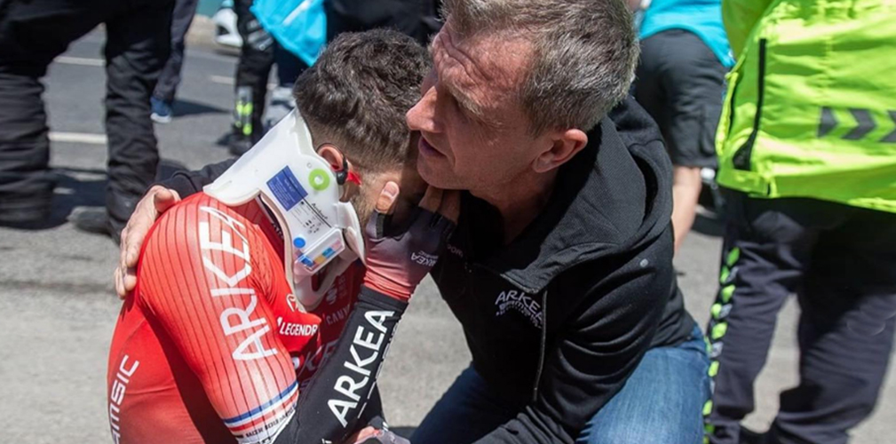 «Mi sono reso conto – ammette il francese – ho subito messo le mani sulla testa per via del dolore e perché mi sentivo come se il collo non ce la facesse a reggerla. Ho pensato al peggio. Ricordo anche che c’erano Emmanuel Hubert, e il mio direttore sportivo (Yvon Ledanois, ndr). Gli ho chiesto perché mi stesse capitando ancora. Avevo già avuto una commozione cerebrale all’inizio dell’anno (il francese era caduto in allenamento ad Altea, in Spagna, e aveva per questo rinviato il debutto, ndr). Ho anche detto che non volevo saperne di più del ciclismo. Con tutto quello che mi stava succedendo, non ce la facevo più. Soprattutto ero spaventato. Pensavo che non li avrei più visti. Tenevo la testa e sentivo che c’era qualcosa di serio».