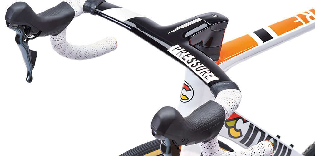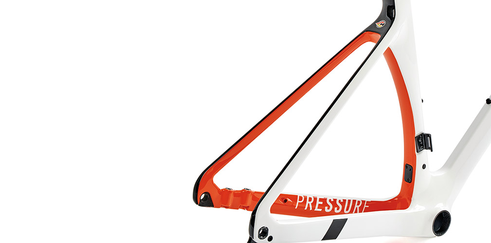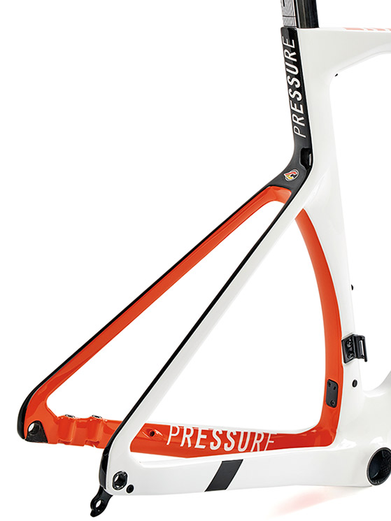 Il sistema ACR del manubrio Vision Metron 5D, con manubrio, serie sterzo e forcella completamente integrati, unito all’uso degli stampi in PU per il passaggio interno dei fili pulito ed efficiente, valorizza l’estetica della livrea Pressure. Il tubo sella aerodinamico e i foderi ribassati sono funzionali alle migliori aerodinamica e rigidità, insieme agli altri elementi aerodinamici del telaio vocati a un controllo e una potenza ottimali. La scelta del thru-axle e dei freni a disco con passaggio interno dei fili, offre il design più pulito e veloce, in una geometria complessiva che porta alla posizione più compatta e aerodinamica del ciclista.