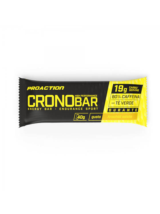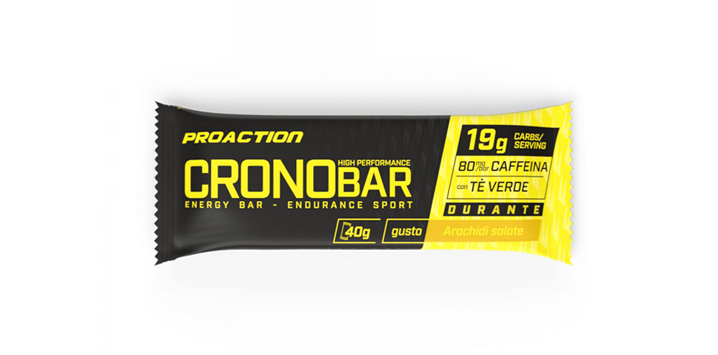 Per chi ai gel preferisse una più classica barretta, ProAction ha creato Crono Bar PRO. Si tratta di una barretta realizzata con pasta di datteri, proteine vegetali e nocciole (per un totale di 25 grammi di carboidrati ad ogni dose). A questa base è stata aggiunta caffeina (80 mg per barretta) e tè verde, in modo da offrire un effetto stimolante utile per contrastare la fatica muscolare. I suoi ingredienti naturali e digeribili ne fanno un grande alleato, pratico e gustoso durante gli allenamenti intensi e le competizioni.