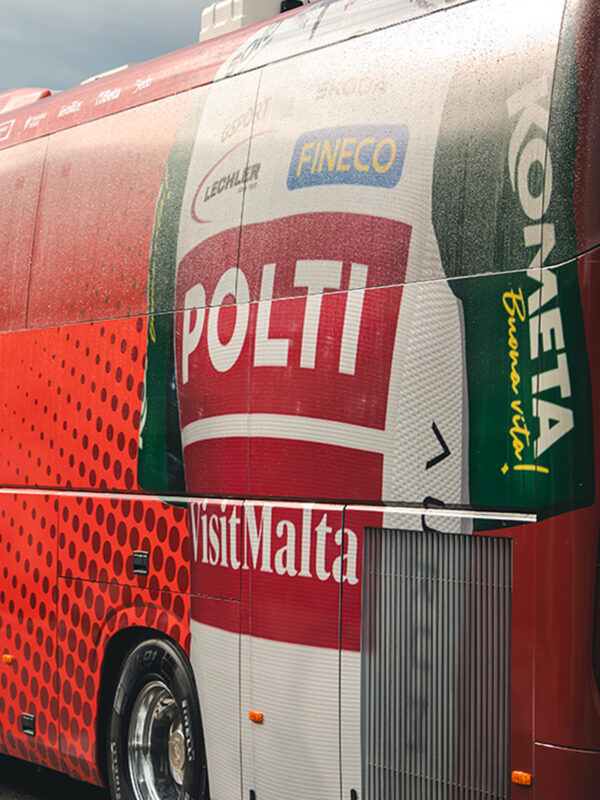 A VisitMalta è stato dedicato il maxi lunotto posteriore con il claim del turismo sull’isolaLa flotta del Team Polti-VisitMalta offre un’immagine di grande coerenzaLa maglia è stata riprodotta sui mezzi più grandi: il pullman, ma anche furgoni e il camion dei meccaniciAnche le Aurum, con colorazione Lechler, riprendono il pantone del pullmanA VisitMalta è stato dedicato il maxi lunotto posteriore con il claim del turismo sull’isolaLa flotta del Team Polti-VisitMalta offre un’immagine di grande coerenzaLa maglia è stata riprodotta sui mezzi più grandi: il pullman, ma anche furgoni e il camion dei meccaniciAnche le Aurum, con colorazione Lechler, riprendono il pantone del pullman