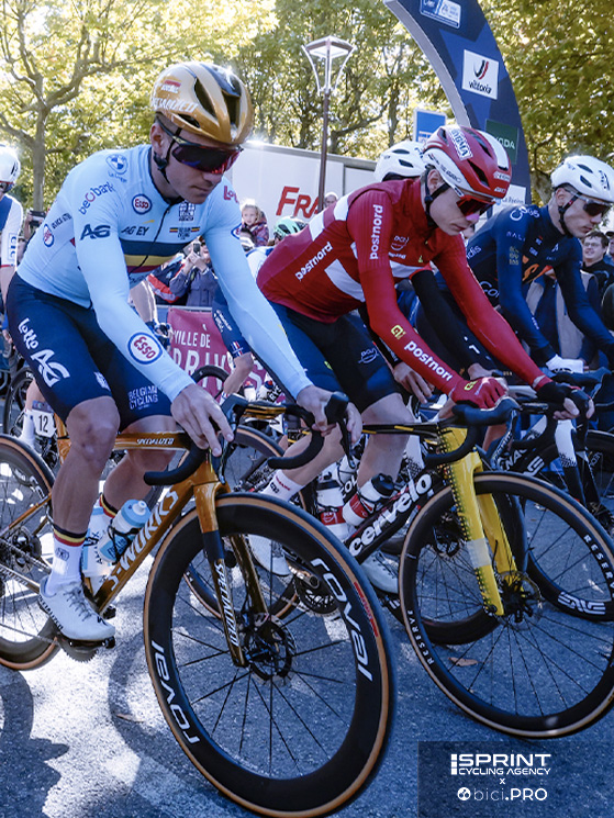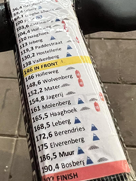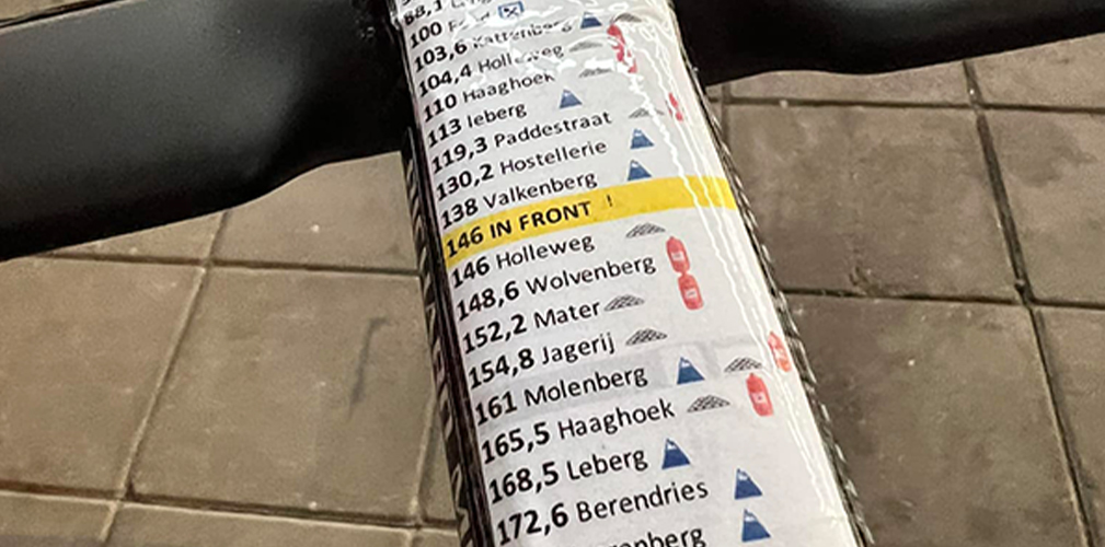 La salita era molto ripida, con tratti al 15 e anche 20 per cento e per gestirla non si potevano cambiare i rapporti bruscamente. La cambiata doveva essere fluida per mantenere la stessa cadenza e non mettere troppa pressione sulle gambe. Nel primo dei due giorni trascorsi sui Vosgi con Bjerg, Pogacar fece tre ricognizioni del percorso. Per il tratto di pianura invece avrebbe usato una monocorona anteriore da 58 denti senza deragliatore.