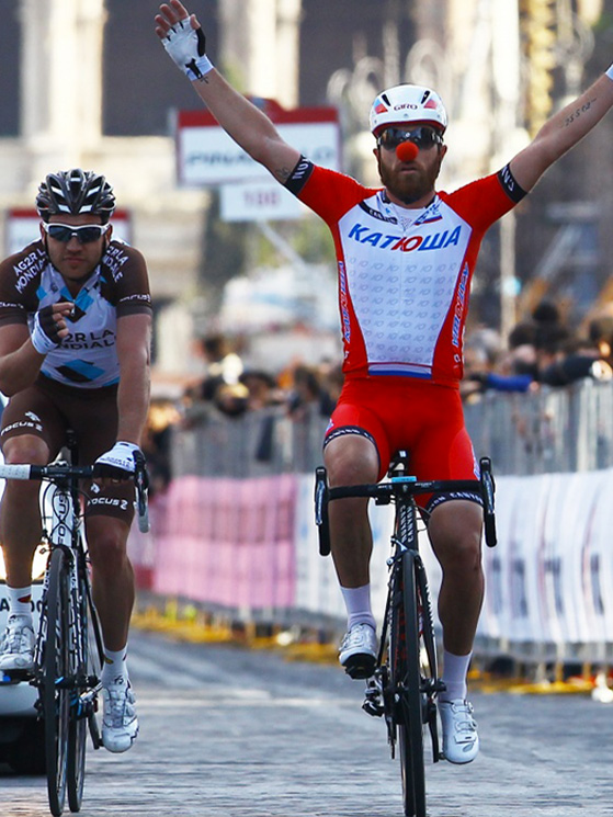 Fra le prese in giro più geniali di allora, ci fu quella del suo grande amico Luca Paolini, che aspettò un anno intero per metterla in atto. Era il 9 marzo del 2014, nell’edizione vinta della Roma Maxima da Alejandro Valverde in cui Pozzato centrò il 12° posto, il comasco allora in maglia Katusha tagliò il traguardo in 52ª posizione, mimando l’arrivo a braccia alzate con un bel naso da clown sul volto.
