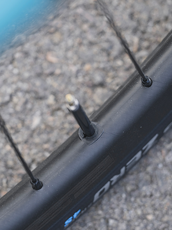 I raggi sono in acciaio, hanno un profilo piatto, sono a doppio spessore e si innestano nel cerchio tramite i nipples esterni. Non ci sono fori interni e il cerchio non ha bisogno del nastro tubeless. Sempre in merito al cerchio, adotta il concetto MoMag, che grazie ad un magnete, permette di estrarre la bussola interna (dal foro della valvola) che blocca il nipples, in caso di manutenzione. Tornando ai raggi: per la ruota anteriore sono incrociati nel lato disco, radiali nel lato opposto. Sulla ruota posteriore sono incrociati da ambo le parti.