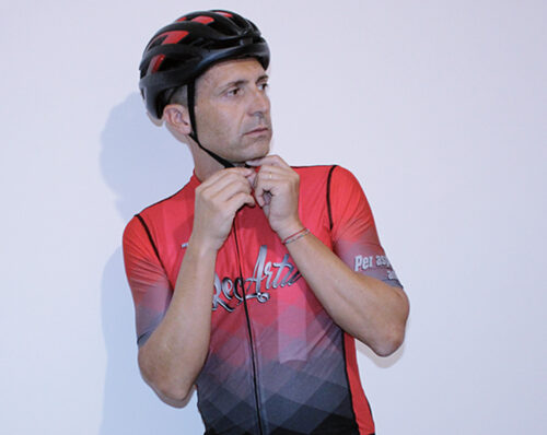 «La parte frontale è quella più aerata. Si tratta di un poliestere leggero, che usano anche per le maglie del Giro d’Italia». Questo materiale favorisce lo scambio dell’aria, ma protegge al tempo stesso. In questo modo la sudorazione non è mai accentuata.