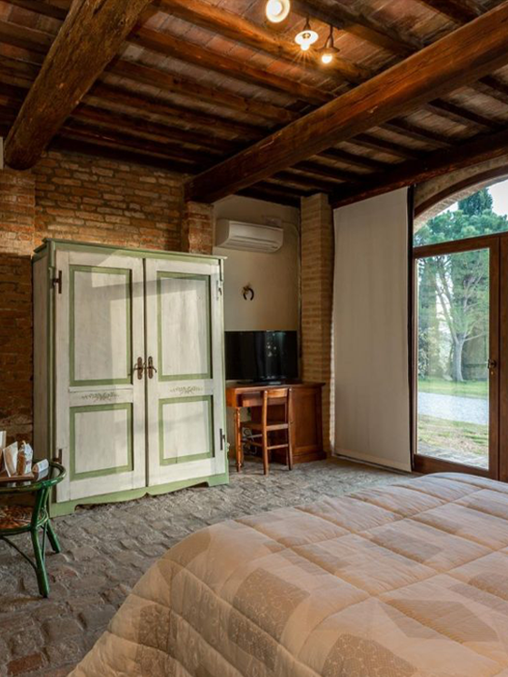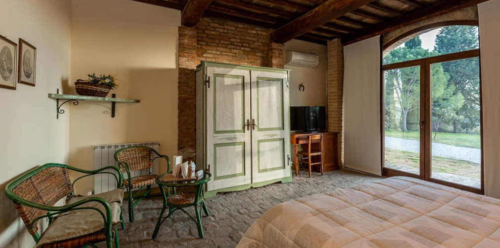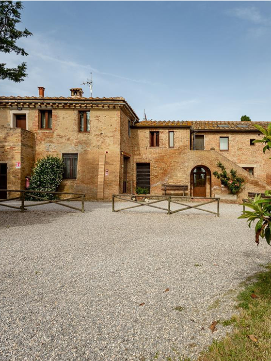 Borgo Pieve a Salti si trova lungo il percoso dell’Eroica Foto dell’interno di una stanza del Borgo Pieve a Salti Il corpo centrale è un fabbricato risalente al XVII secolo