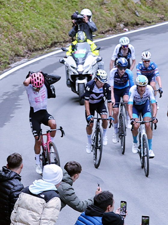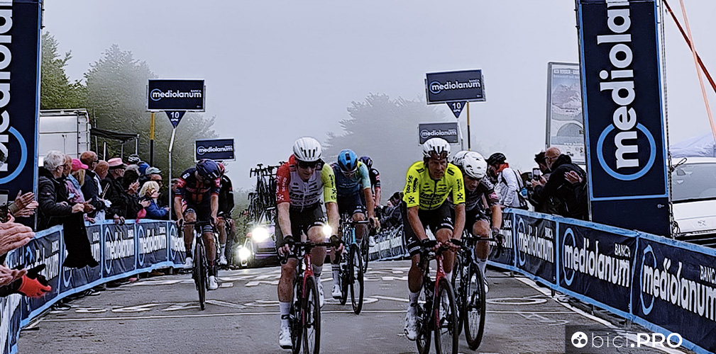 La maglia rosa pedalava bene. Carapaz era defilato, a tratti in coda al gruppetto. Era in “modalità” risparmio energia o era davvero affaticato? Il suo volto è quasi sempre indecifrabile. Giulio Pellizzari a 200 metri dalla vetta era staccato di 6”-7”, ma non sembrava assolutamente fuori giri. Primoz Roglic era il più coperto e rannicchiato al centro del drappello. E e gli Yates, seppur con maglie diverse, si riconoscevano anche attraverso la nebbia. La loro andatura ciondolante sui pedali è un marchio di famiglia.