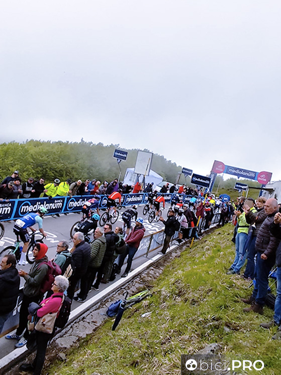 Il tifo era forte per Luca Covili, beniamino di casa. Ma lungo la scalata c’erano anche belgi e olandesi. Poi il tifo è per tutti e quando dai nuvoloni bassi in quota è spuntata la maglia blu di Lorenzo Fortunato tutto ha preso un’altra piega. Vederli da bordo strada è tutt’altra cosa. Si sentiva il fiatone, le smorfie di fatica si percepivano in modo diverso ed erano la continuazione dello sforzo delle gambe. Più queste erano tese, più i volti si deformavano.