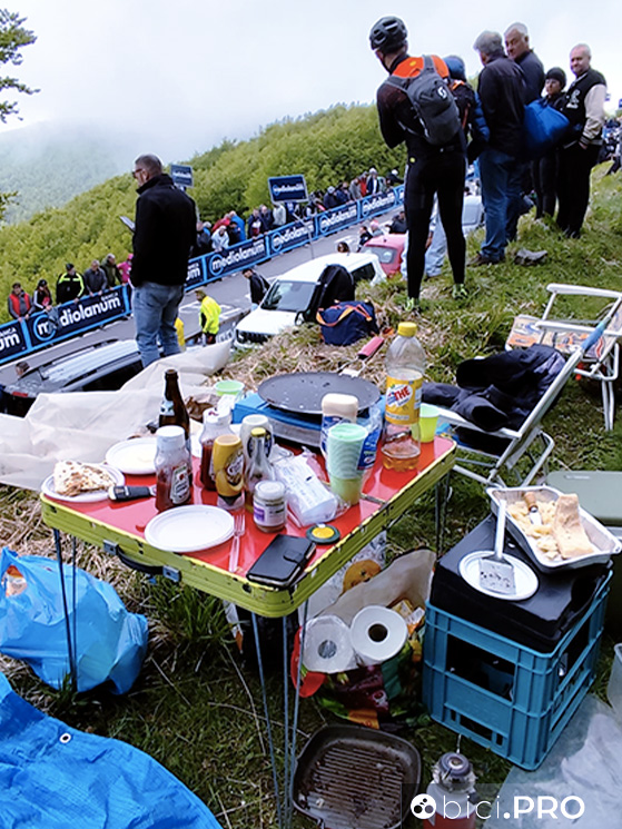 Grigliate, birre, tocchi di formaggio, le bici appoggiate sulle pendici della montagna. Una montagna verdissima, rigogliosa. Sulle vette più alte verso nord c’erano ancora chiazze di neve… un ambiente totale, teatro perfetto per una grande sfida.
