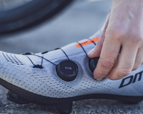 La parte mediana e superiore invece, grazie alla membrana Carbitex (usata anche per le scarpe da running e da calcio di altissima caratura) che la avvolge da destra a sinistra e anche al Boa con il cavo che incrocia, è rigida e sostenuta, fascia bene il piede e nel punto dell’arco plantare “tira” parecchio, con un’efficienza di alto livello. Non è un dettaglio a nostro parere, perché sfruttare al meglio il punto dell’arco non è comune neppure alle scarpe di altissima gamma. La linguetta è sottile e ha spessori diversi che permettono di dissipare le compressioni dei rotori e dei relativi cavi, che incrociano per entrambi.