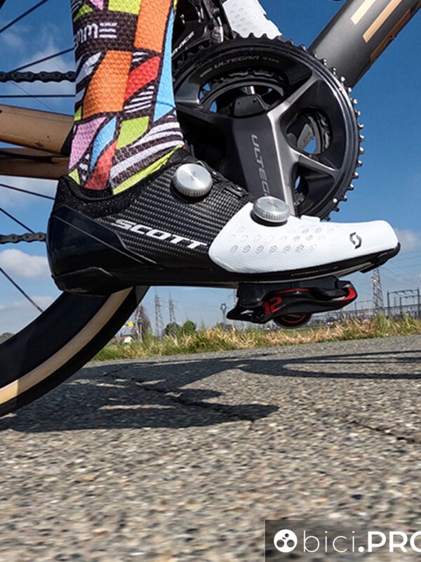 La suola è completamente in carbonio HMX, la stessa matrice di fibra composita utilizzata per costruire i telai di alta gamma. E’ fatta bene, curata e gli inserti in gomma aiutano a preservare la scarpa. Prende forma seguenzo l’ultimo filone di Scott, dove c’è anche l’ultima versione della Foil.